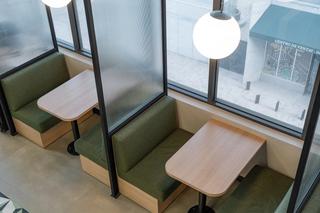 The project adopts an industrial aesthetic, visible in the exposed slab, the metal window frames, and the installations, but softens it through the use of green. This chromatic thread introduces freshness, warmth, and balance into an urban interior. Beyond aesthetics, the color also enhances the environmental perception of the space, contributing to user comfort and well-being.
