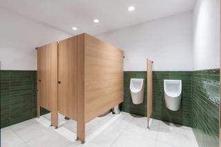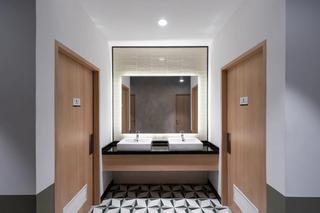 The palette features cementitious textures that define circulation, as well as wood accents in furniture, floors, and wainscoting, and green tiles and textiles. Combined with the transparency of fluted glass, these materials create a pared-down yet distinctive identity.