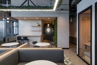To maximize functionality, the space is organized around a logical layout that prioritizes service efficiency, smooth circulation, and effective use of space. At the core is a central node that integrates the reception, printing area, kitchenette, meeting room, storage, and other service spaces. The men’s and women’s restrooms are located adjacent to this hub. By concentrating services at the center of the floor plan, work areas are arranged along the perimeter, leaving the intermediate zones open for collaboration and informal meetings.