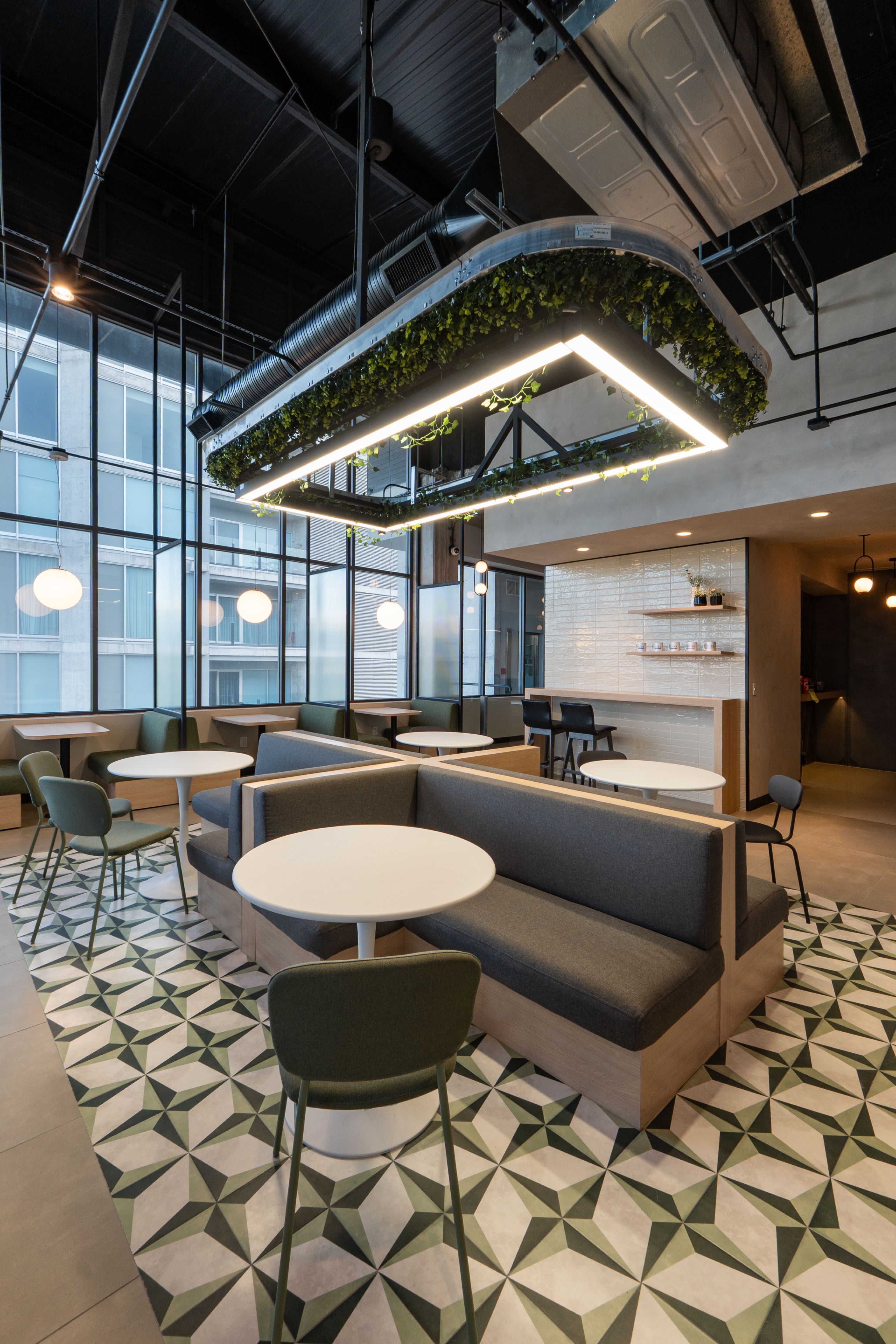 The project adopts an industrial aesthetic, visible in the exposed slab, the metal window frames, and the installations, but softens it through the use of green. This chromatic thread introduces freshness, warmth, and balance into an urban interior. Beyond aesthetics, the color also enhances the environmental perception of the space, contributing to user comfort and well-being.